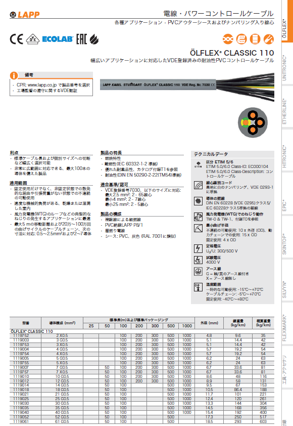 制御用ケーブルのなかで、最も良く使われるLAPP製品といえば、汎用タイプの「オイルフレックス・クラシック110」が挙げられるでしょう。広範囲のオイルと化学薬品への耐性を有しながらも、堅牢で柔軟な性質があります。またケーブル外径が小さいため、配線スペースの削減が行える点もメリットのひとつです。