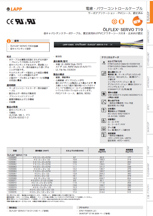 LAPP社のサーボモータ用(インバータ用)ケーブルには「オイルフレックス・サーボ 700シリーズ」があります。