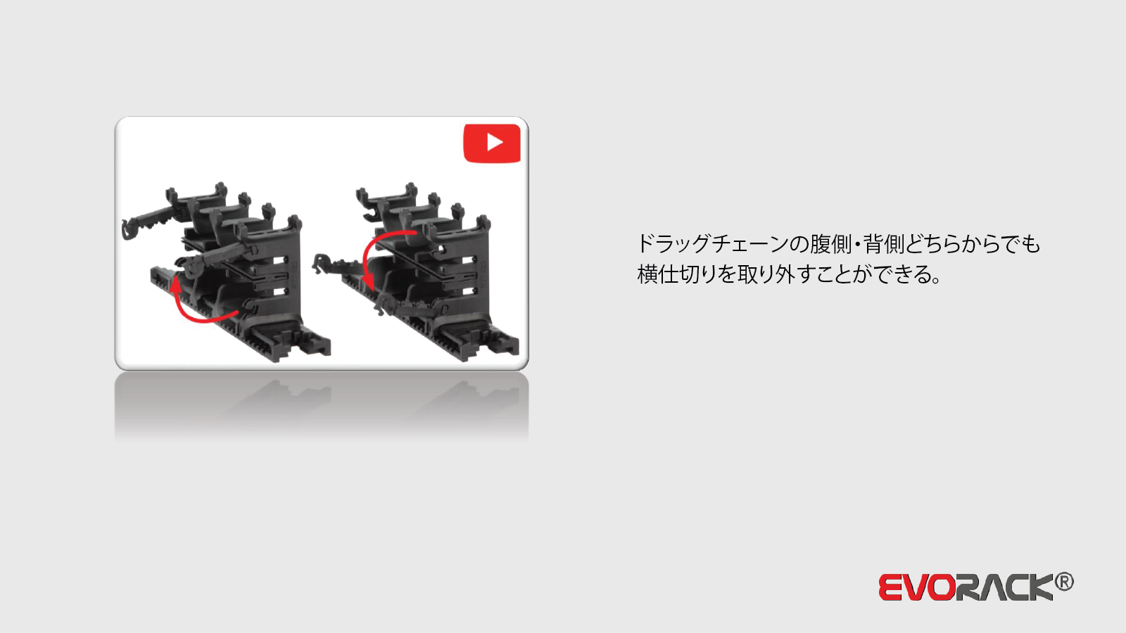 同社で定評のあるシェルフシステムがさらに進化しました。ケーブル構成によってフレキシブルな設計が可能という長所はそのままに、メンテナンス性を改良しドラッグチェーンの腹側・背側のどちらからも横仕切りを付け外し可能になりました【★写真7】。