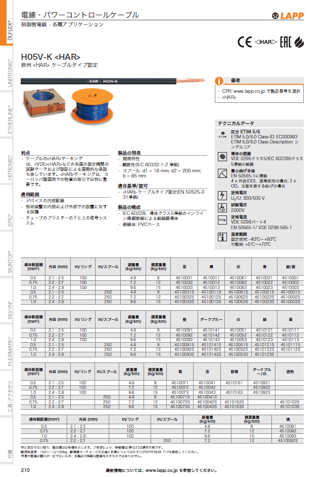 ヨーロッパ諸国での物資取引で特に重要となるHAR規格に対応するシングルコア(単線)制御盤用ケーブルです。H05VとH07Vでは導体断面積の範囲が異なり、H07Vのほうがより大きなシリーズを用意しています【★写真8】。