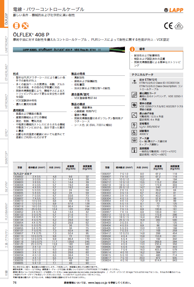 耐摩耗・耐油性に優れたVDE認定コントロールケーブルです。シース付きで408Pは絶縁体がPVC、440Pは絶縁体がPUR(TPE)で全天候対応になっています。PURは熱可塑性の樹脂で、PVCの特性だけでは不十分な場合に使われます。実績としては、耐油性があることからマシニングセンタなどの工作機械に採用されています【★写真6】。
