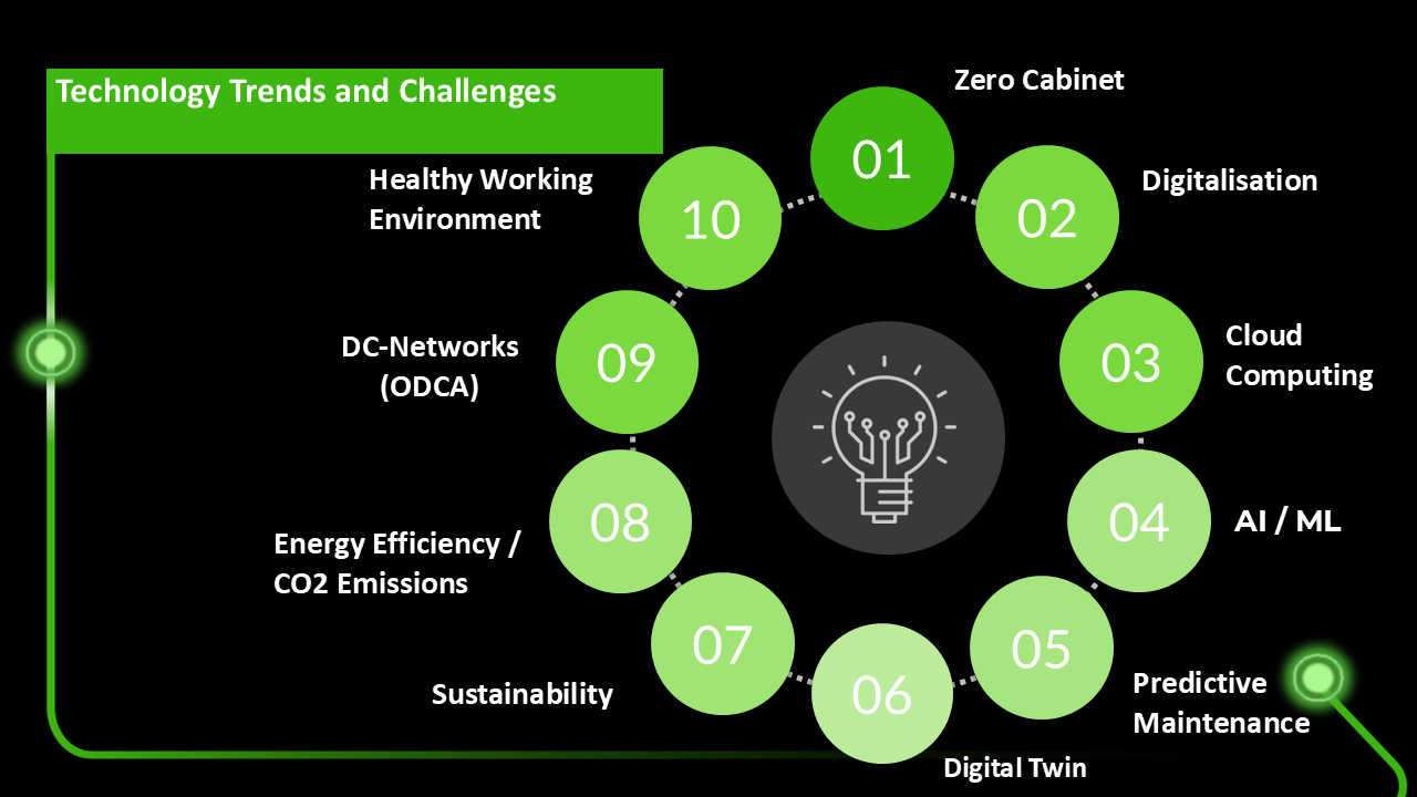 産業オートメーションの現場では、デジタル化やクラウドコンピューティングの普及、AI・機械学習の導入、デジタルツインの活用、エネルギー効率の最適化、そして作業者の健康に配慮した職場環境づくりなど、複数の課題が同時に進行しています(図1)。