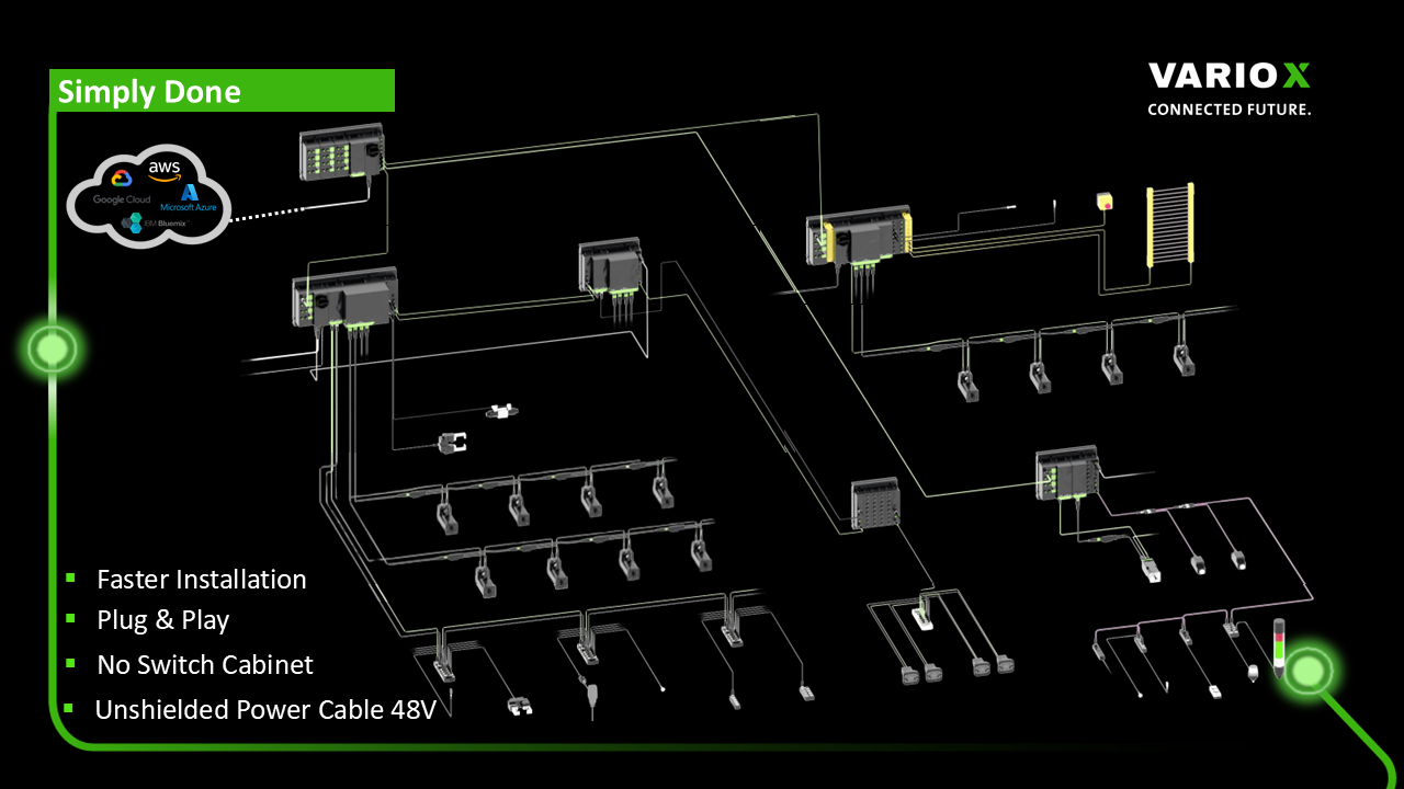 Vario-Xはセンサやケーブルの削減とプラグ&プレイ接続によって、装置・機器の接続やシステム立ち上げを「より速く・簡単に・柔軟に」実現します。