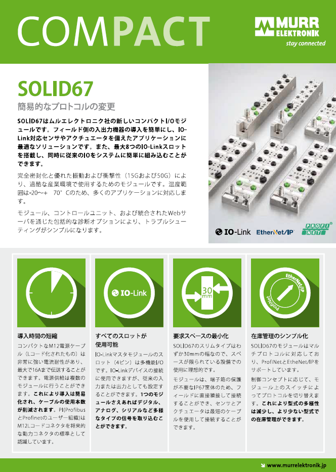 またSOLID67には、IMPACT67にはない特徴があります。それは8ポートすべてがIO-Linkに対応する製品を用意していることです。(ちなみにIMPACTは、IO-Link×4ポート、もしくはIO-Link×2ポート)。SOLID67では、1つのモジュールによって、IO-Linkデバイスの接続だけでなく、従来のデジタル、アナログ、シリアルなど、多様なタイプの入出力信号を取り込めます(異なるDIO構成とIO-Link構成による6種の製品を用意しています)。