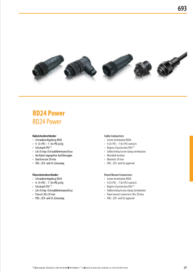 「RD24」(パワー693シリーズ)【★写真1】は、工作機械などのパワーサプライ用として重宝されている小型丸形コネクタです。感電しない安心・安全な設計で、価格もお手頃な人気シリーズです。VDE、UL、SEVといった規格(一部除く)を取得していることがセールスポイントで、海外輸出製品への組み込み用としても重宝されています。